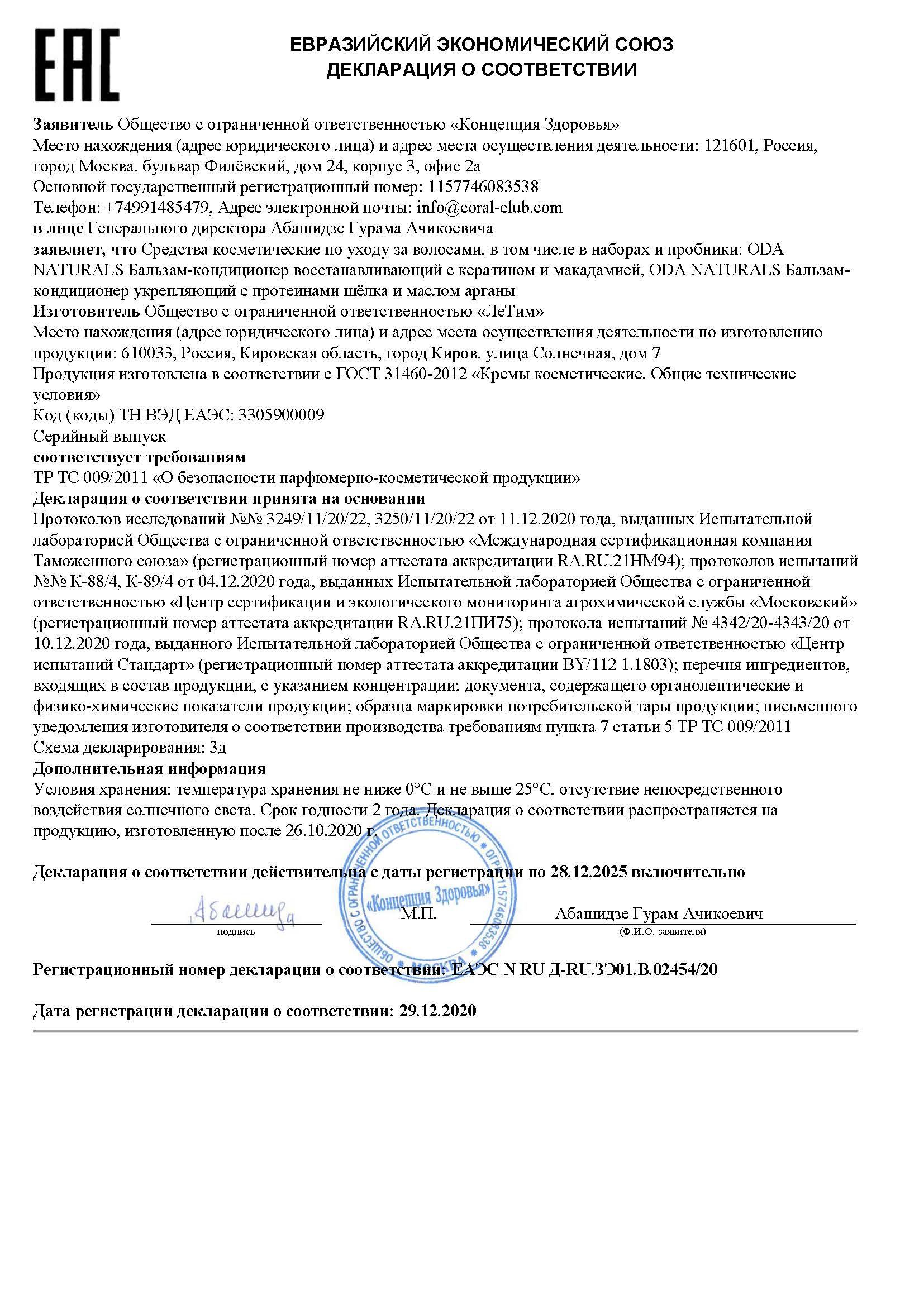 БАЛЬЗАМ-КОНДИЦИОНЕР УКРЕПЛЯЮЩИЙ ODA Naturals