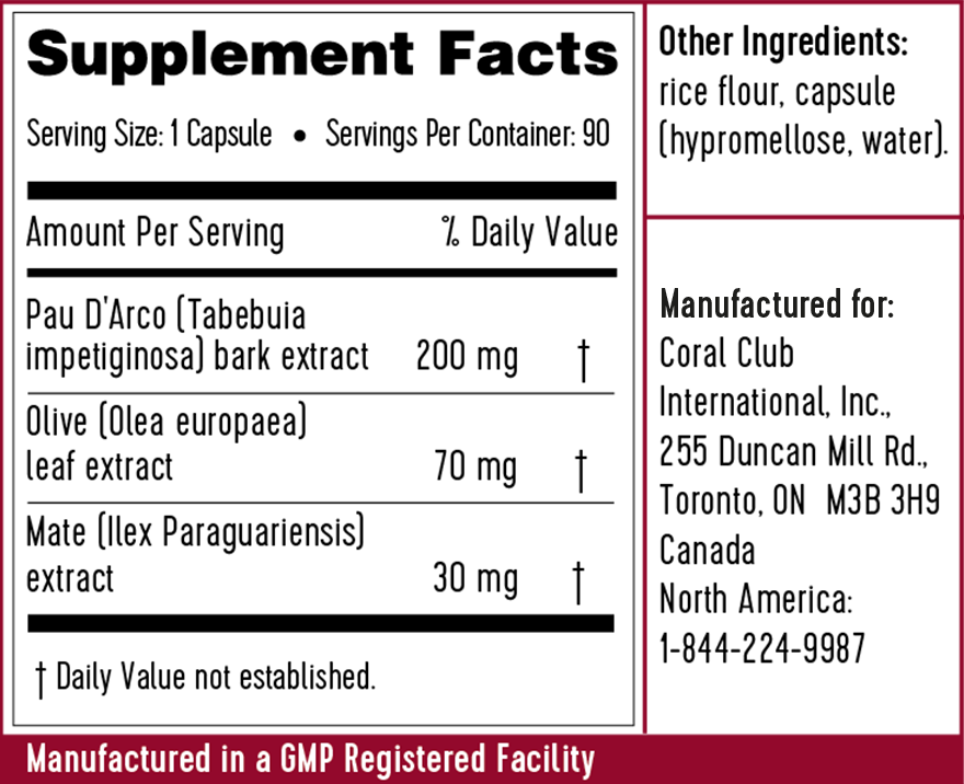 на 1 капсулу% РУСП Экстракт коры муравьиного дерева (Tabebuia Impetiginosa), мг 200 † Экстракт листьев оливы европейской (Olea Europaea), мг 70 † Экстракт листьев мате (Ilex paraguariensis), мг 30 † Вспомогательные компоненты: Рисовая мука, Кокосовый порошок, Капсула (гидроксипропилметилцеллюлоза). † Рекомендуемый уровень суточного потребления не определен БАД. НЕ ЯВЛЯЕТСЯ ЛЕКАРСТВЕННЫМ СРЕДСТВОМ